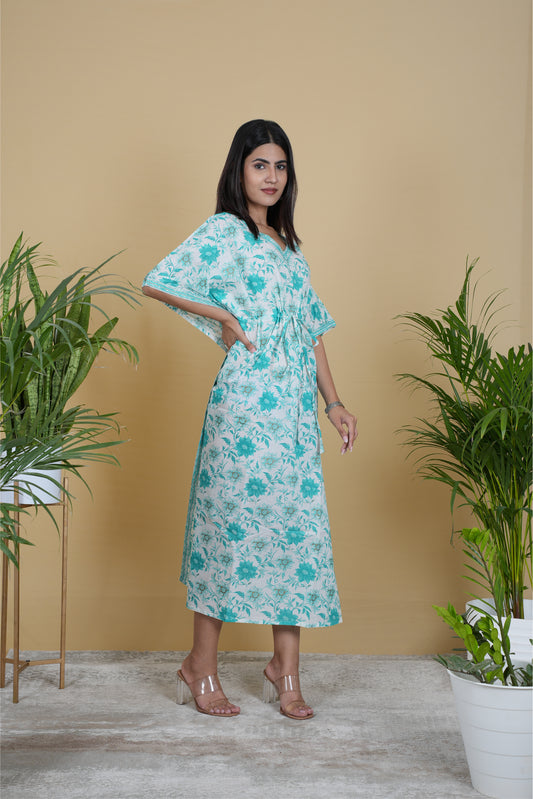 WHITE TURQUOISE FLORAL KAFTAN LONG