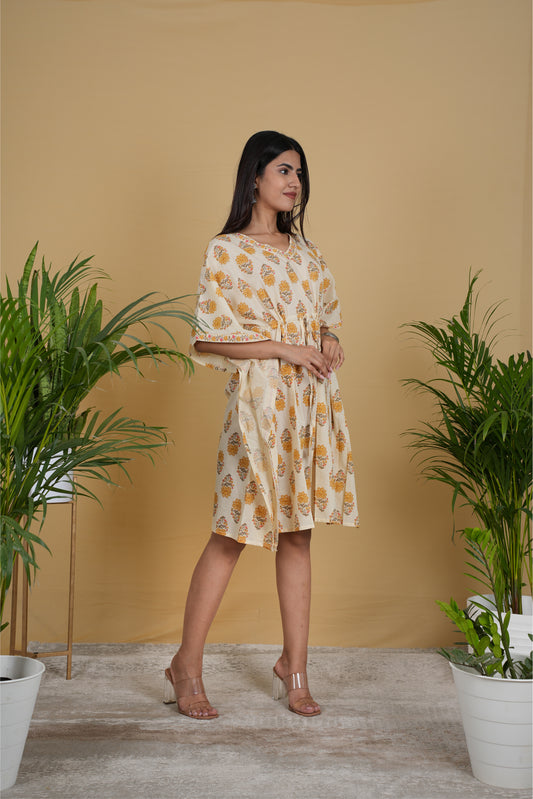 OFF WHITE MUSTARD MUGHAL BLOCK PRINT KAFTAN SHORT