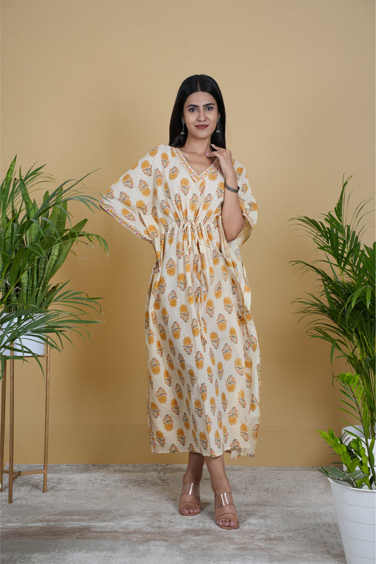 OFF WHITE MUSTARD MUGHAL BLOCK PRINT KAFTAN LONG